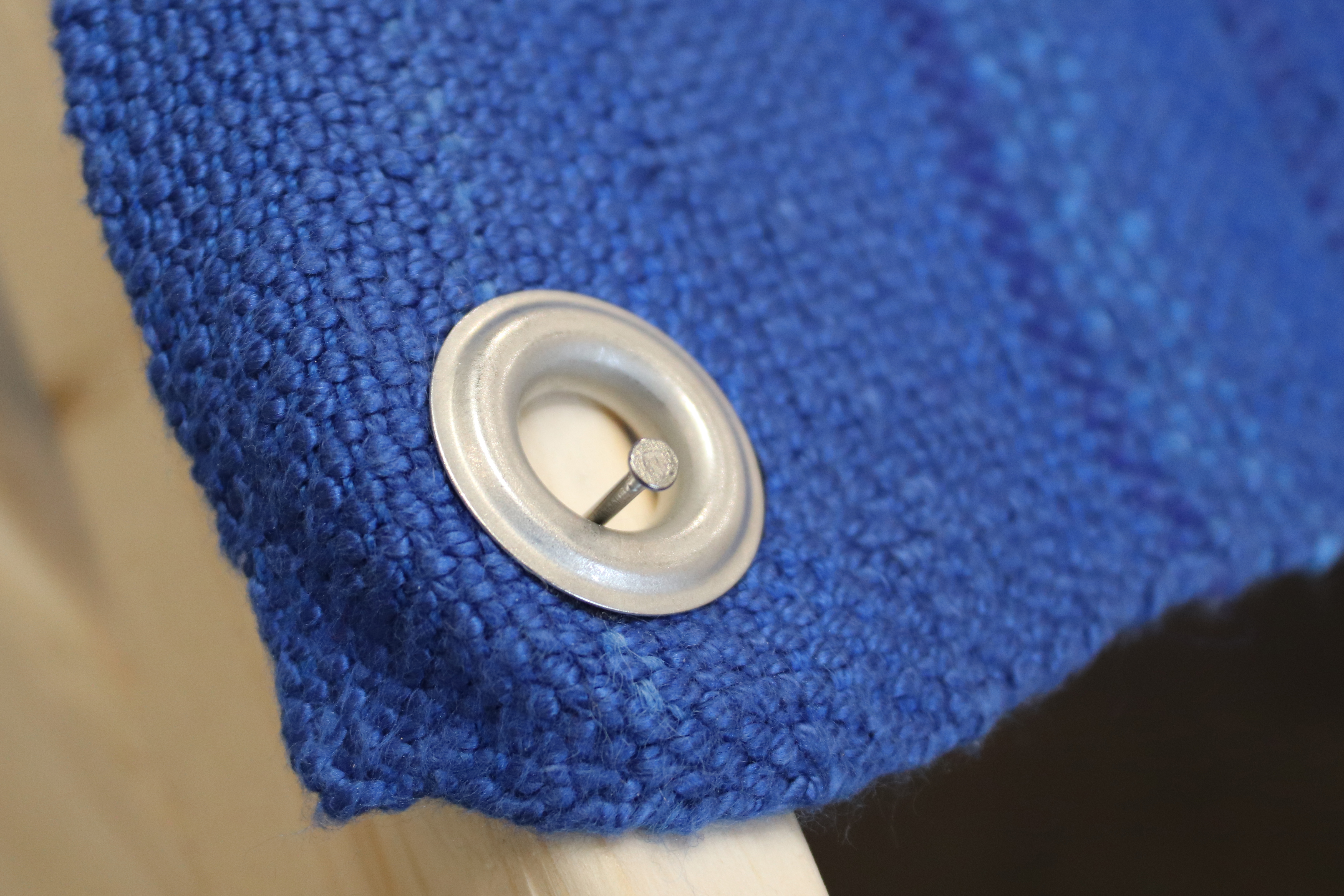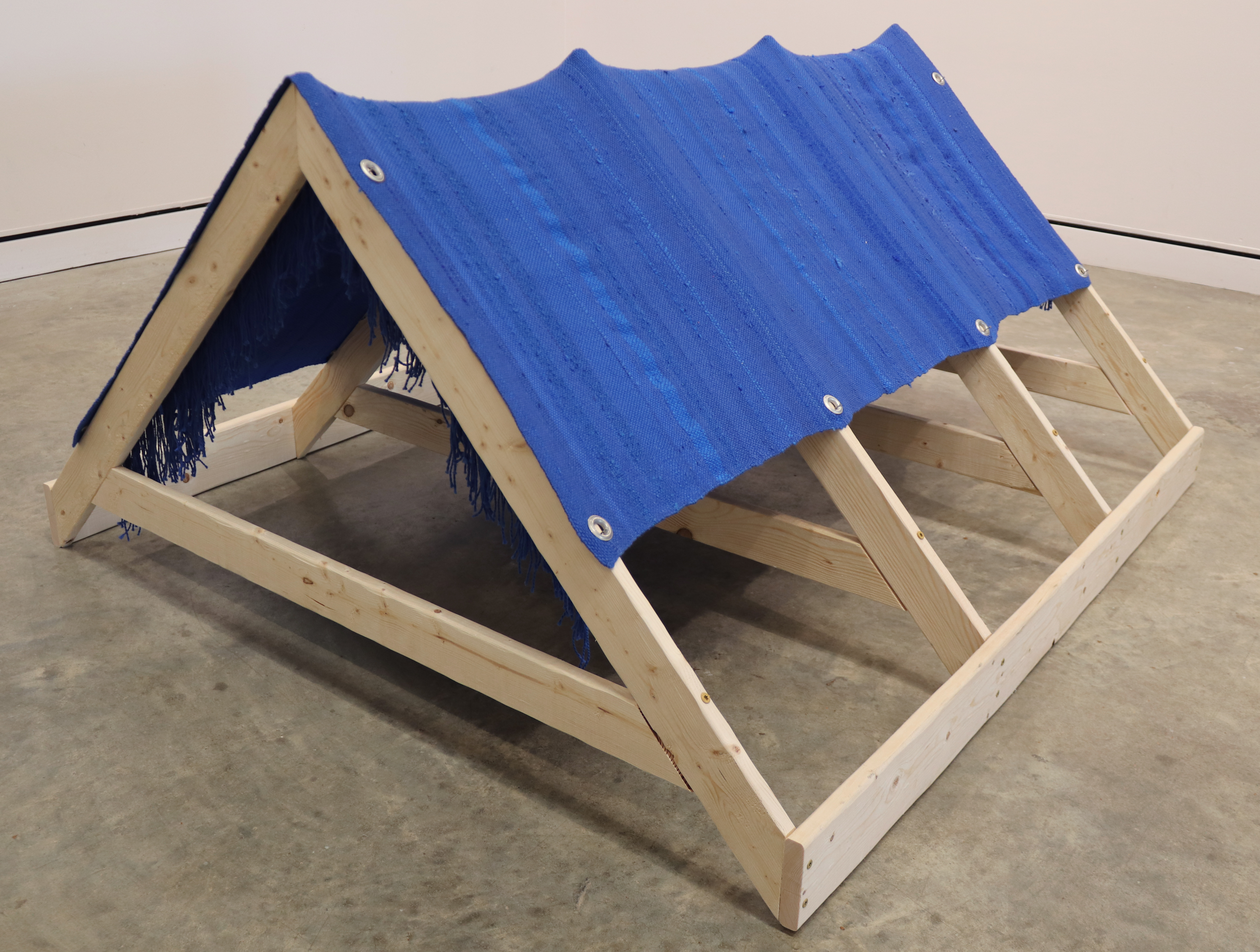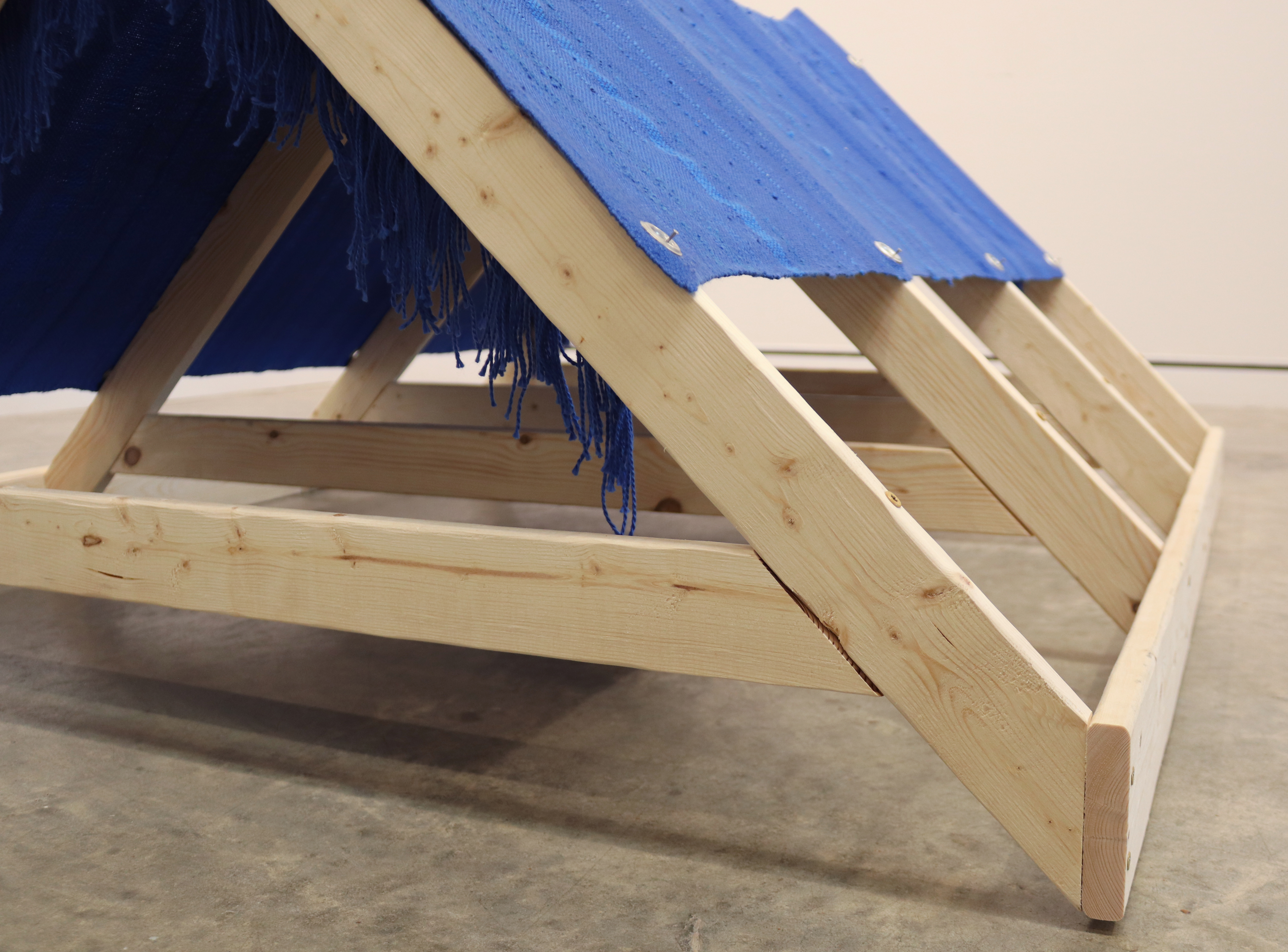 Wrap Yourself in Comfort, 2021, 24″ x 47″ x 48,” wood, hardware, handwoven cotton, acrylic and wool
