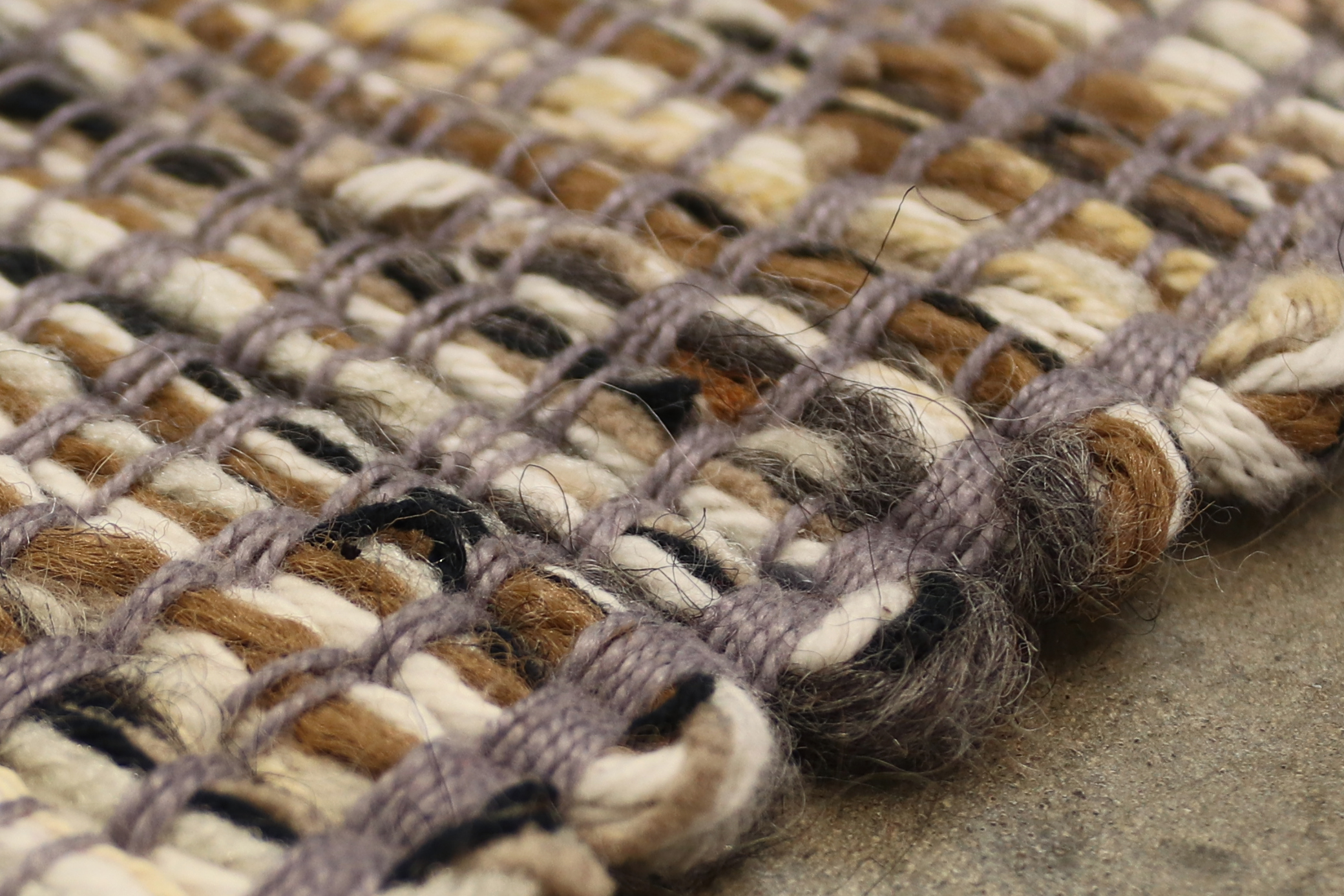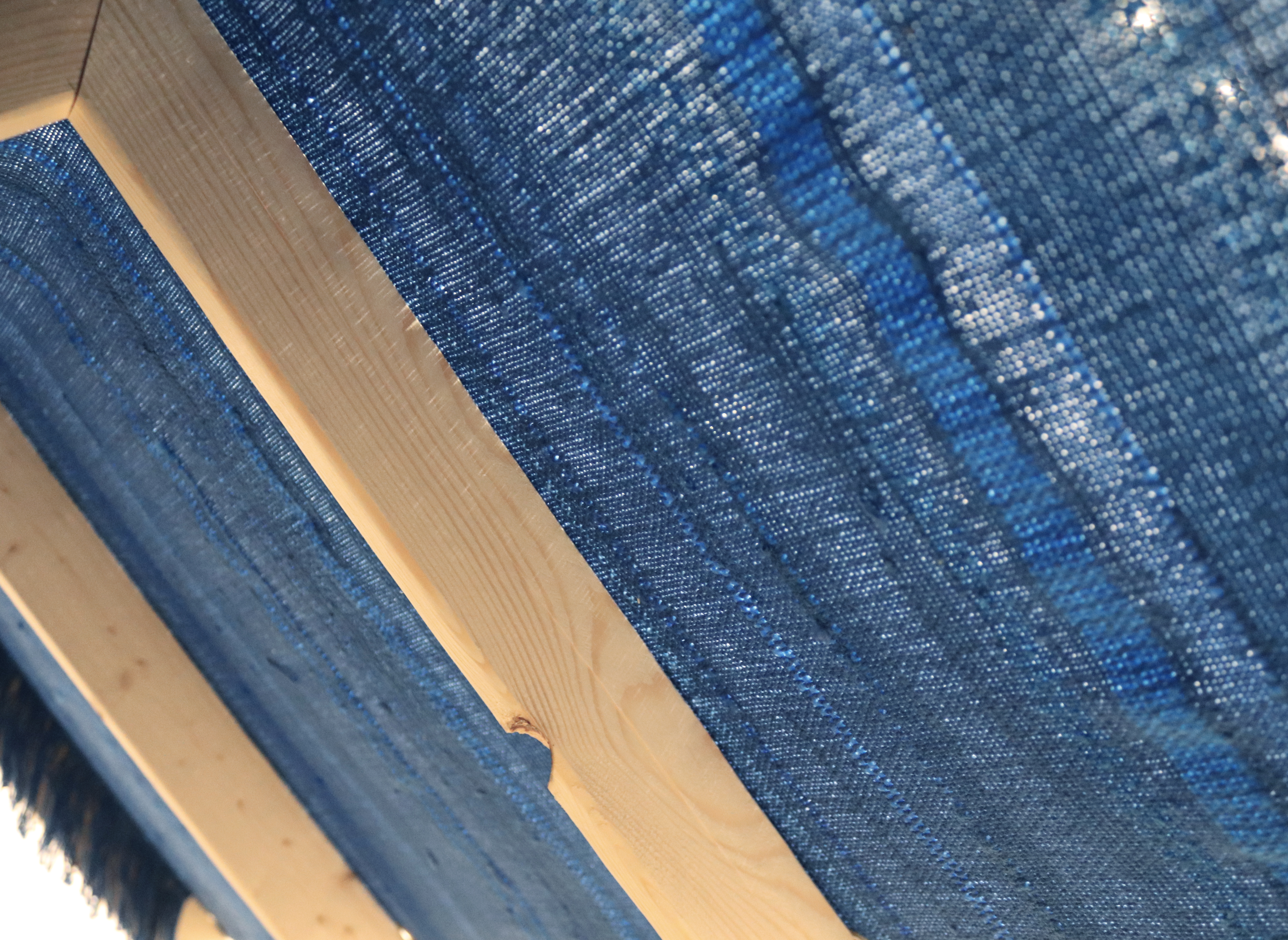 This piece is living fabric that functions as a wall hanging and rug. It continues to grow through additions of found fibers: loom waste, broken blind cord, shopping bag handles, shoelaces, remnant yarn and excess thread from hems.