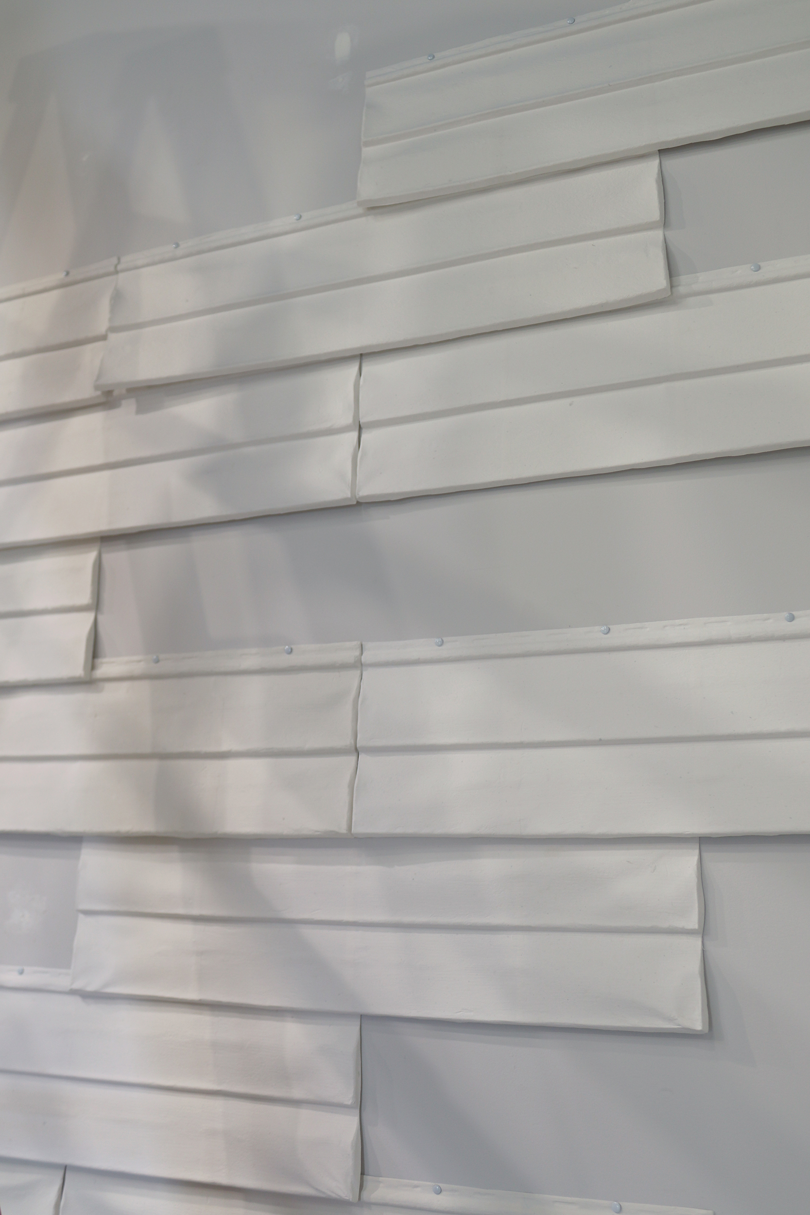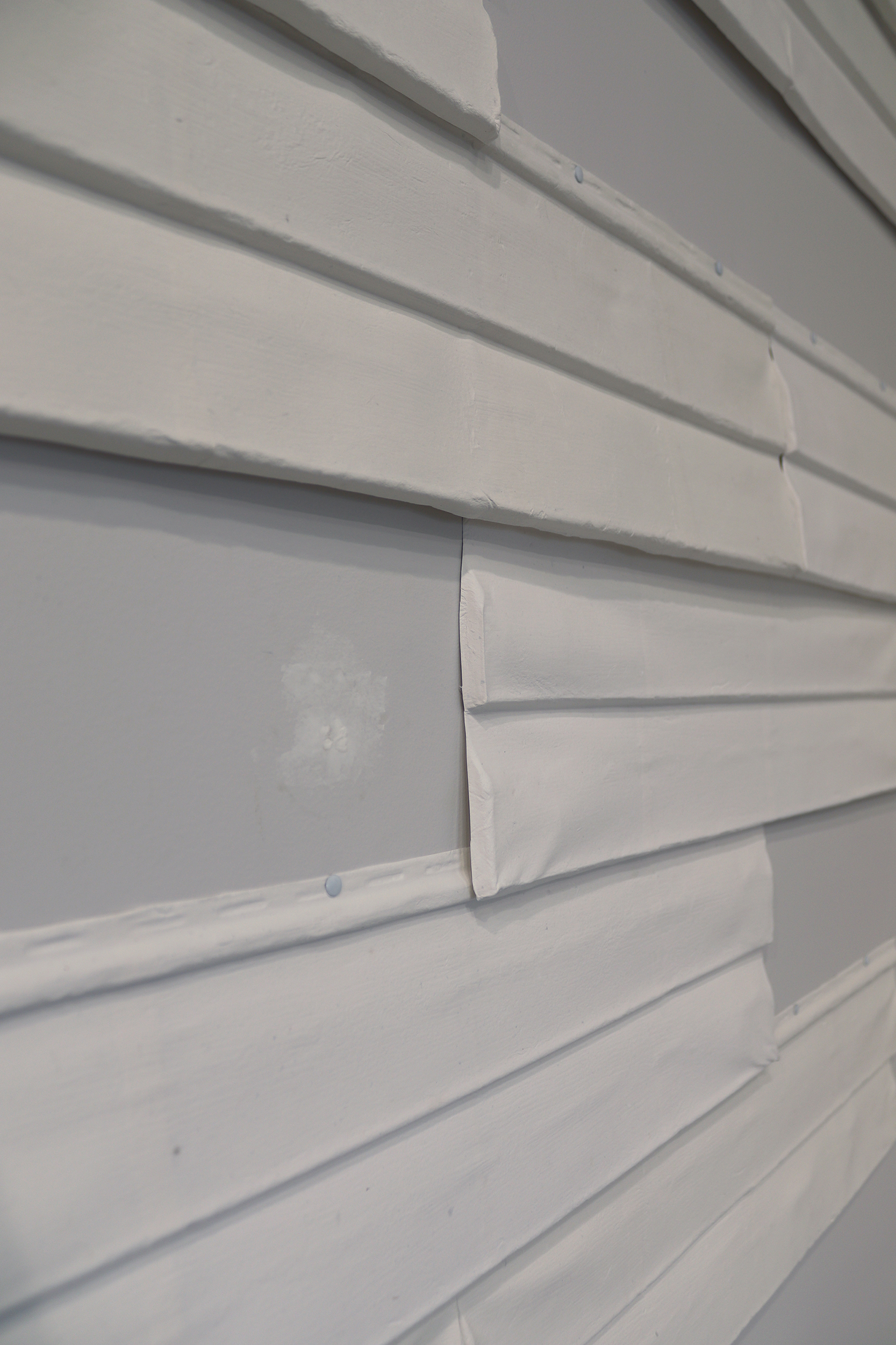 Installation/Deinstallation. The history of the gallery walls are visible through the layers of spackle, paint and holes. Placement of the cast house siding both highlights and hides the labor from previous exhibited work.