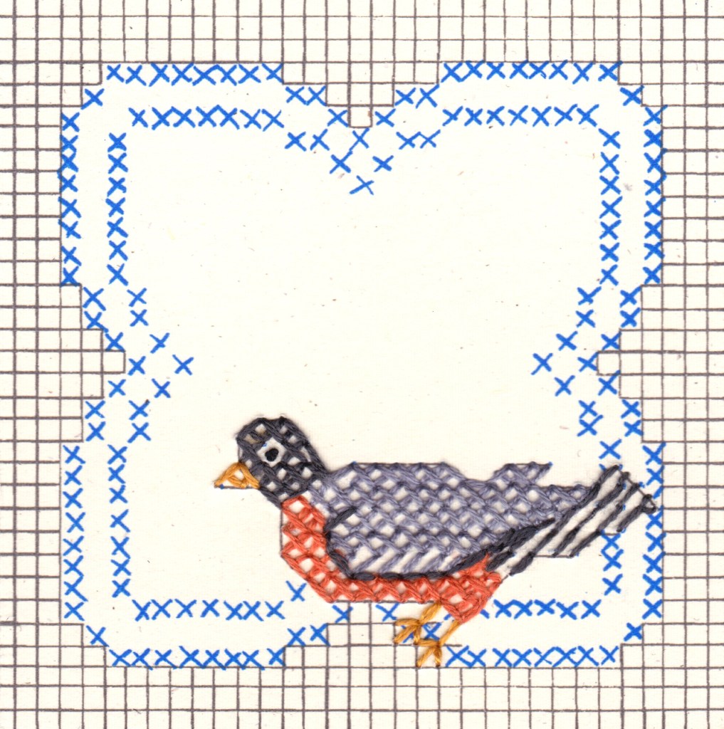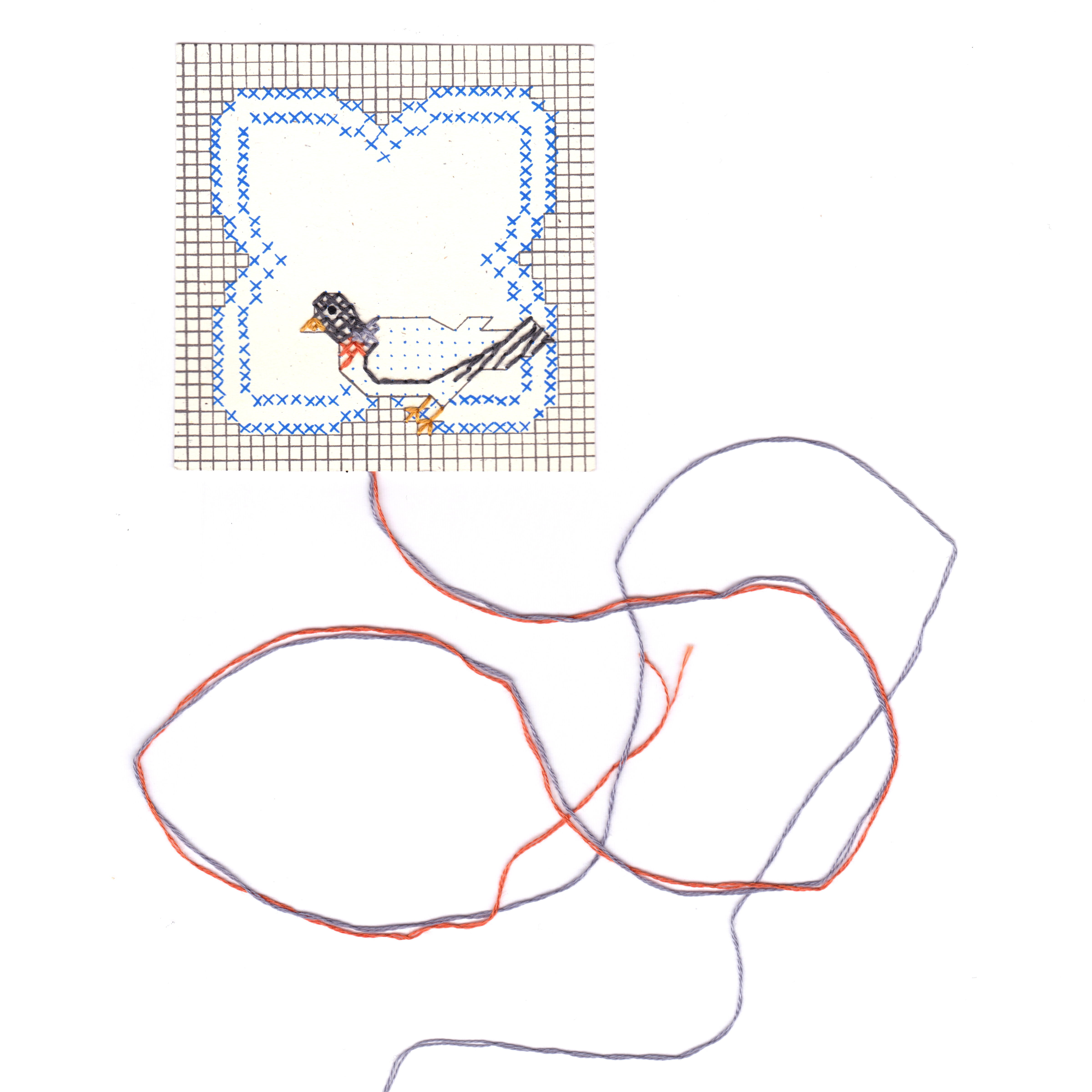 Sewn Together, 2026, 3″ x 3,” silkscreen, collaborative cross stitch